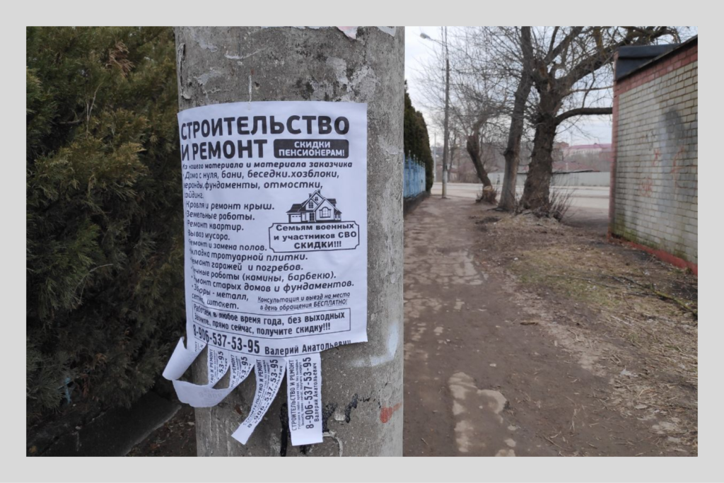 Ещё город живёт подсобными хозяйствами и мелким бизнесом: это магазины электроники, шиномонтажные мастерские, строительные работы. Почти на каждом столбе или заборе — объявления частников: «Продам картофель», «Парикмахерские услуги», «Развал-схождение». На одном из объявлений приписка: «Участникам СВО и ветеранам — скидки».