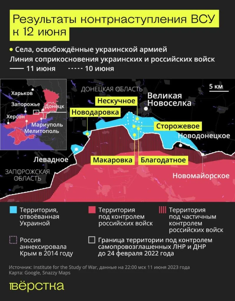 За неделю штурмов к 12 июня ВСУ смогли отбить пять небольших населенных пунктов в окрестностях Великой Новосёлки Донецкой области