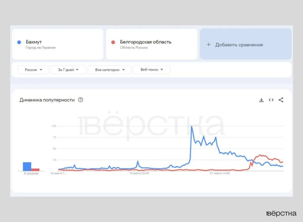 20 мая, когда владелец ЧВК Вагнера Евгений Пригожин объявил якобы о долгожданном взятии Бахмута, динамика популярности названия города в поисковых запросах в тот день достигла 100, после чего начала постепенно снижаться и к утру 22 мая опустилась до 25. Тем же утром стали появляться сообщения о том, что украинские диверсанты вошли в Белгородскую область. Уже к 14:00 по Москве индекс поисковых запросов «Белгородская область» перебил индекс запросов «Бахмут» — 22 против 19.