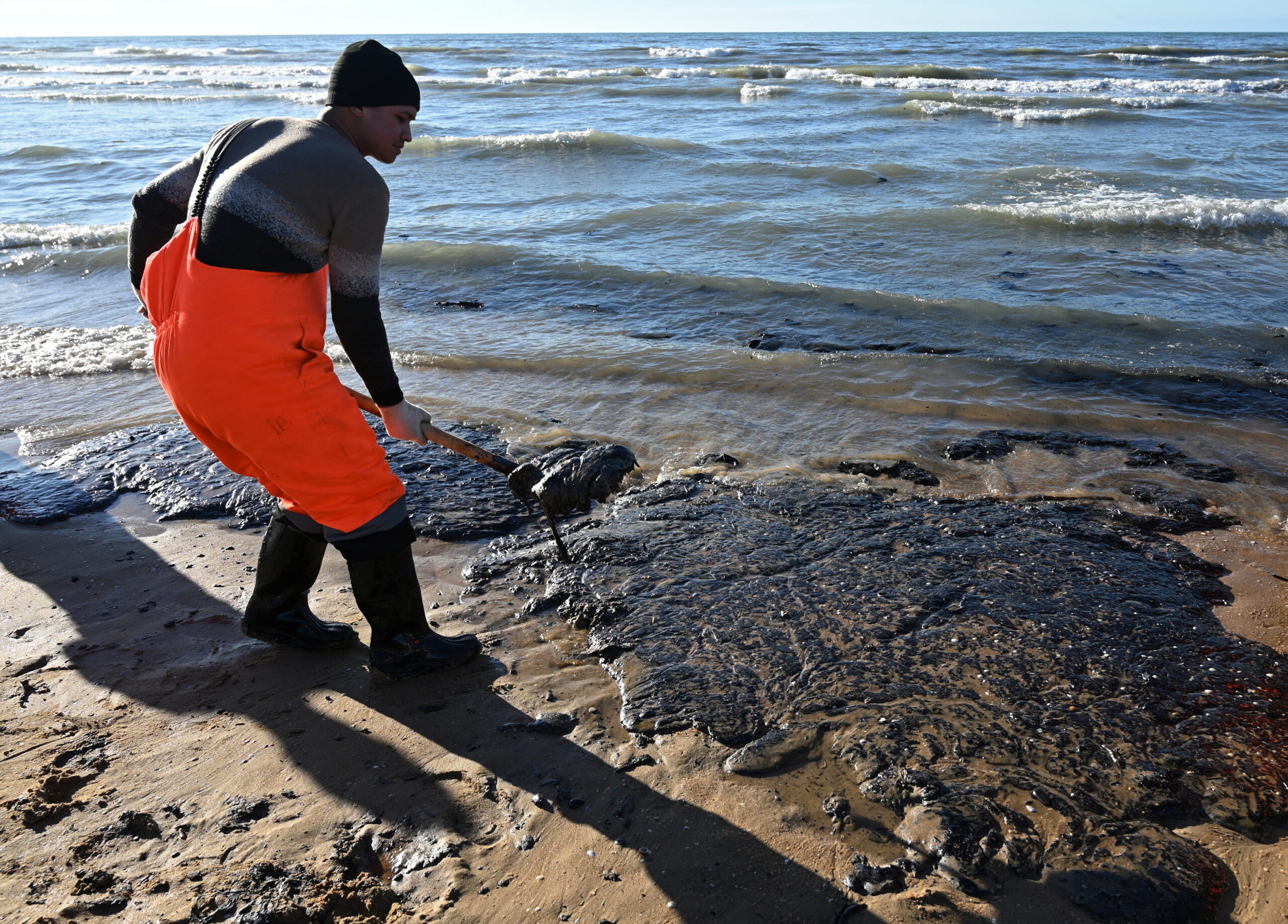 Фото: Волонтёр убирает мазут с пляжа в Витязево под Анапой. 24 декабря 2024 года. REUTERS/Sergey Pivovarov