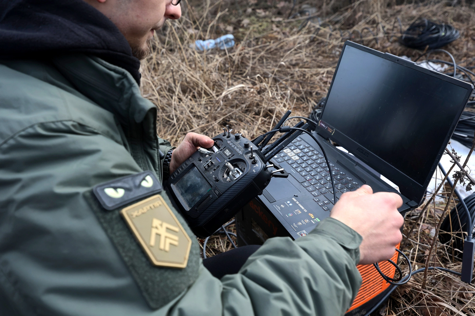 Фото: Военнослужащий 13‑й оперативной бригады Нацгвардии Украины в Харькове испытывает наземную станцию управления и беспилотник «Шмель», 5 марта 2026 года. Viacheslav Madiievskyi/Ukrinform via Reuters Connect