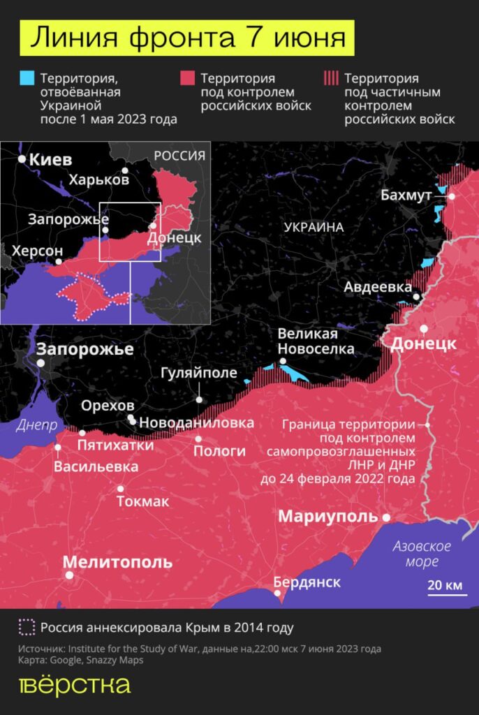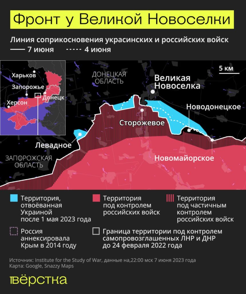 Днём ранее замминистра обороны Украины Анна Маляр сообщала, что украинские силы вблизи Бахмута перешли от оборонительных операций к наступательным. При этом пророссийские блогеры отмечали, что 7 июня украинские войска контратаковали на северо-западной окраине Донецка в районе Невельского, Водяного и Опытного, а также — нанесли наземные удары по административной границе между Донецкой и Запорожской областями, следует из сводок Института изучения войны.