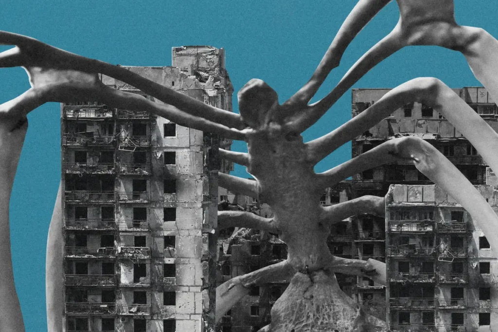 «Даже когда мы [в Мариуполе] жили, отопления не было, не было света и воды, многие продолжали жить в подвалах, — говорит она. — Знаете, самое удручающее, шокирующее то, что вы видите чёрный дом, где дыры в стенах, обугленные жилища; и рядом вы можете увидеть светящееся окно, в котором до сих пор живут люди».
