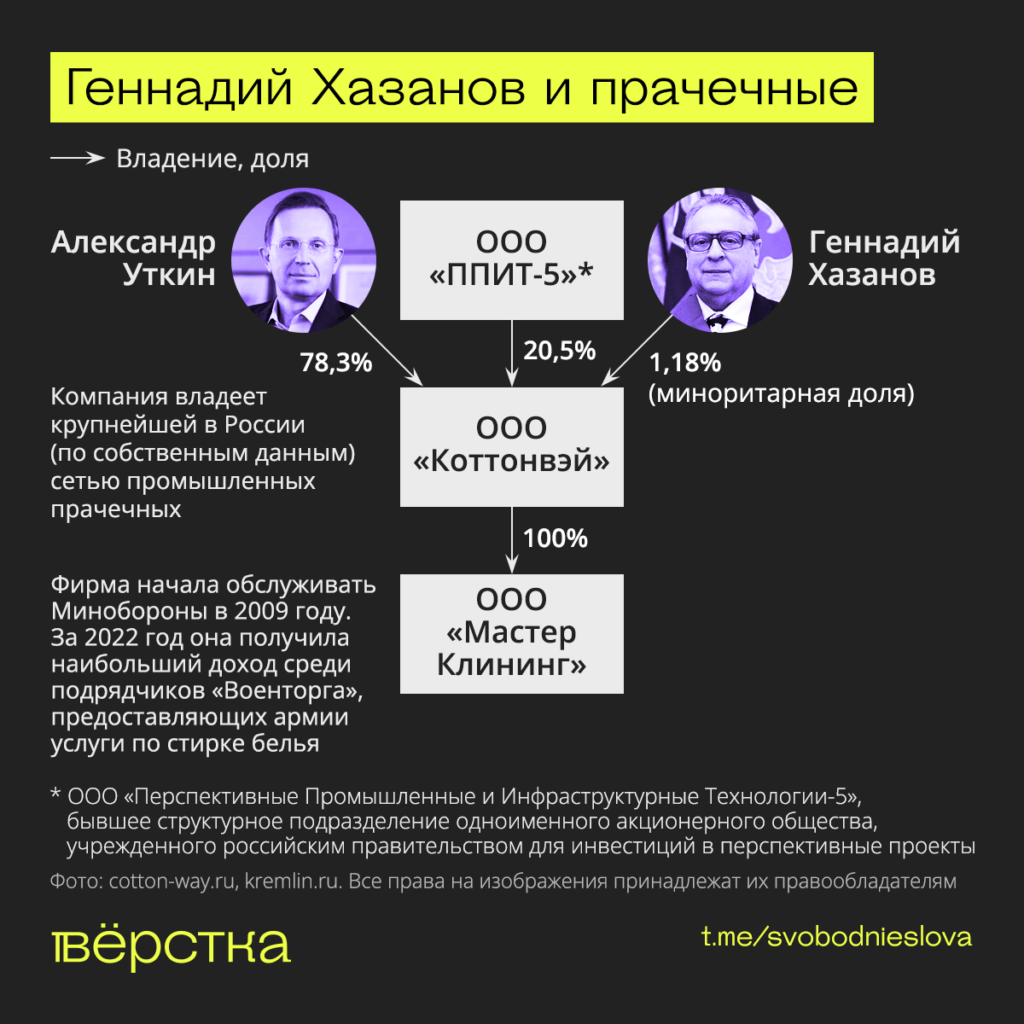 • Среди подрядчиков, оказывающих услуги по стирке белья, больше всего денег в 2022 году заработало ООО «Мастер Клининг». Частью компании владеет российский и советский актёр театра и кино Геннадий Хазанов, выступавший против войны;