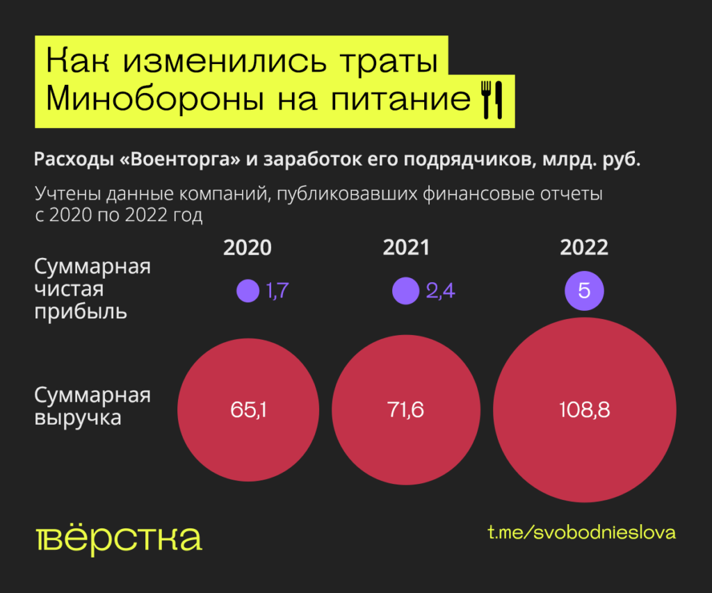 На питание российских военных в 2022 году из бюджета могли потратить не менее 109 млрд рублей — такова выручка 27 компаний, сотрудничающих с «Военторгом»i. Это в полтора раза больше, чем показатели тех же 27 компаний в довоенный 2021 год (71,6 млрд рублей) или на 67% больше, чем в 2020 году (почти 65 млрд рублей).