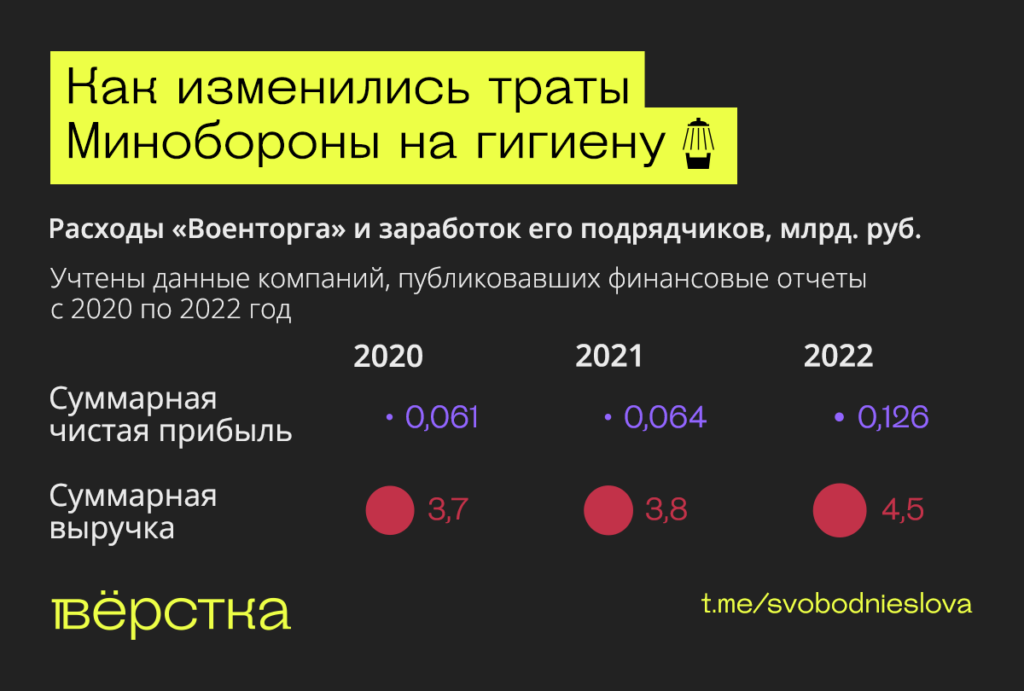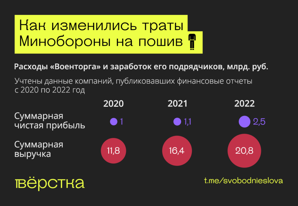 Всего за 2022 год выручка только половины подрядчиков «Военторга» по стирке белья составила более 4 млрд рублей. Это выше, чем в довоенный период: в 2021 году выручка тех же фирм была более 3,6 млрд рублей, а в 2020 — около 3,4 млрд рублей. Общая чистая прибыль этих же компаний в полтора раза превысила довоенные показатели: 138,6 млн за 2022 год против 90,7 млн за 2021 и практически 80 млн в 2020.