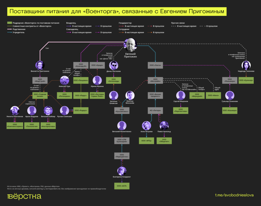 Питание для военнослужащих — самая затратная задача, возложенная на «Военторг». Справляться с ней компании помогают 32 подрядчика. То, что среди них значатся и компании, связанные с погибшим в авиакатастрофе Евгением Пригожиным, ни для кого не секрет. Об этом, в частности, заявлял Владимир Путин после бунта ЧВК «Вагнер». Но насколько большой объём подрядов приходится на структуры «кремлёвского повара» — не было известно. СМИ и независимые расследователи связывали с Пригожиным как минимум 12 компаний-партнёров «Военторга» i. Но «Вёрстка» установила связь ещё шести подрядчиков Минобороны с бизнес-империей Пригожина: ООО «Комплекссервис»i, ООО «Альтернатива» i, ООО «Потенциал»i, ООО «Перспектива»i, ООО «Элтехнорд»i, ООО «Нико»i