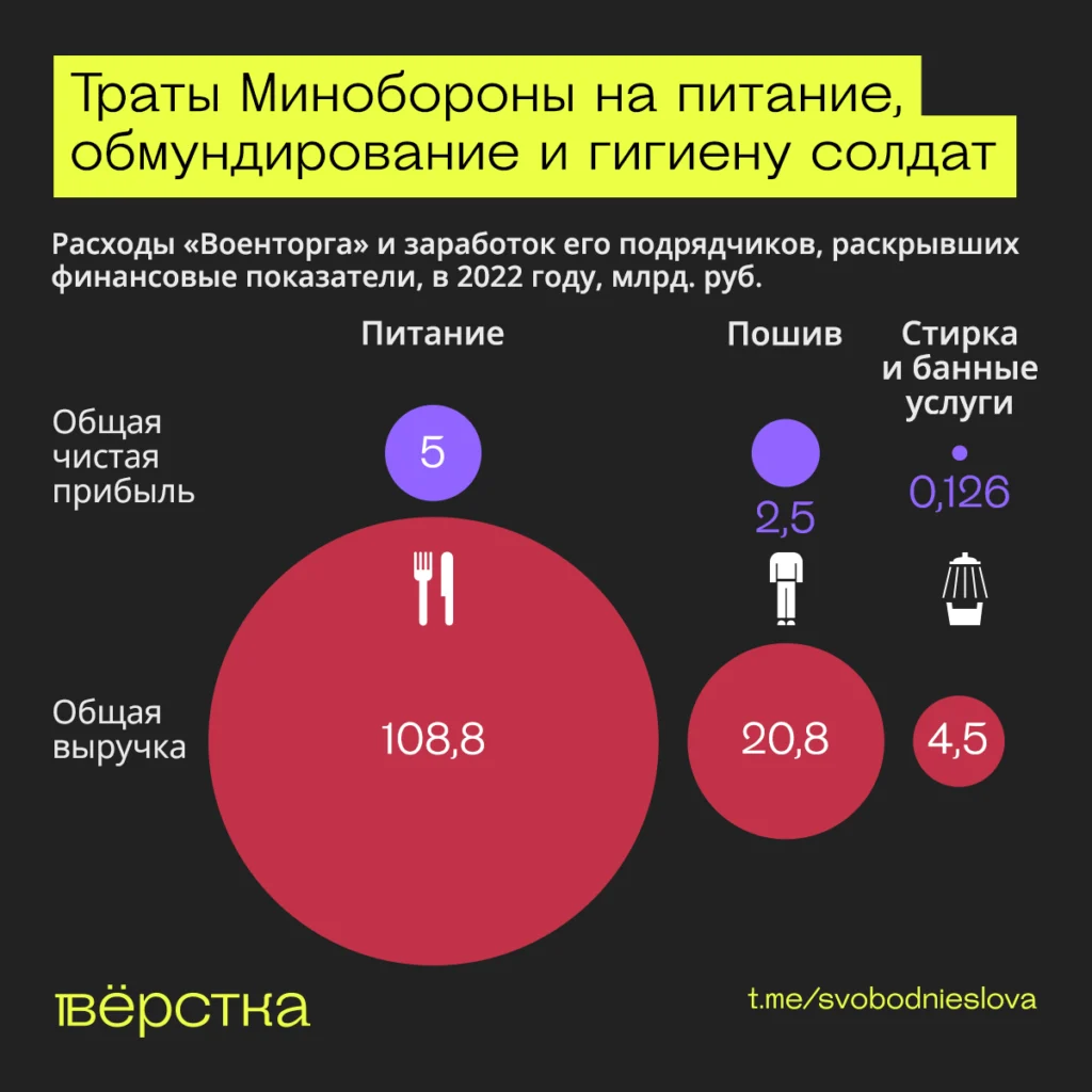 Минобороны уже год как засекретило свои расходы по разделу «Национальная оборона». Но «Вёрстка» выяснила, сколько в 2022 году там потратили денег, чтобы накормить, одеть и умыть солдат. Через АО «Военторг» десятки подрядчиков занимаются организацией питания, пошива, стирки одежды, а также организуют помывку личного состава российской армии. «Вёрстка» изучила финансовые отчёты, запутанные схемы владения компаниями и выяснила, как растут траты Минобороны, а главное — кто и сколько на этом зарабатывает.