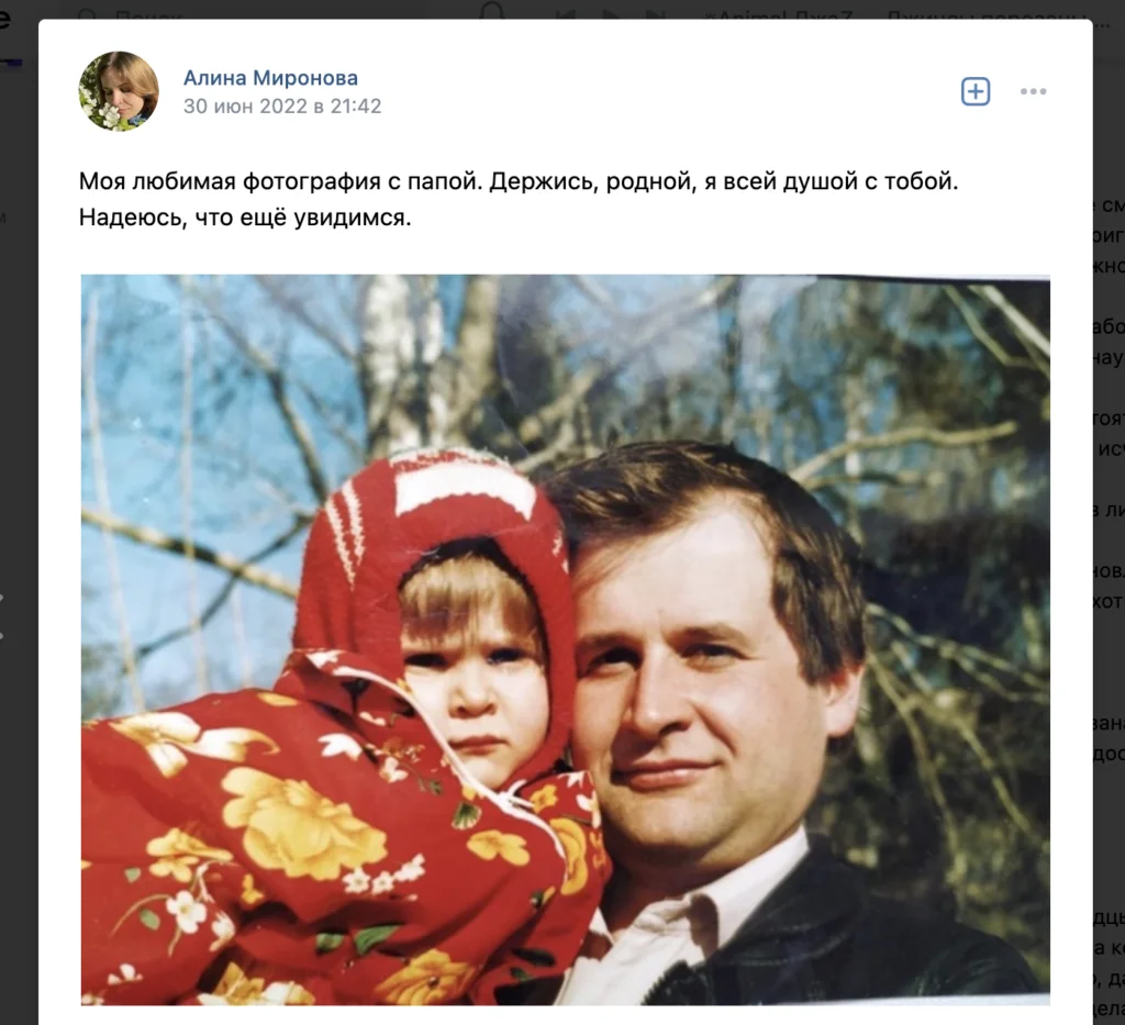 Алина Миронова, дочь Дмитрия Колкера, как и её брат, пыталась привлечь внимание общества к аресту отца.