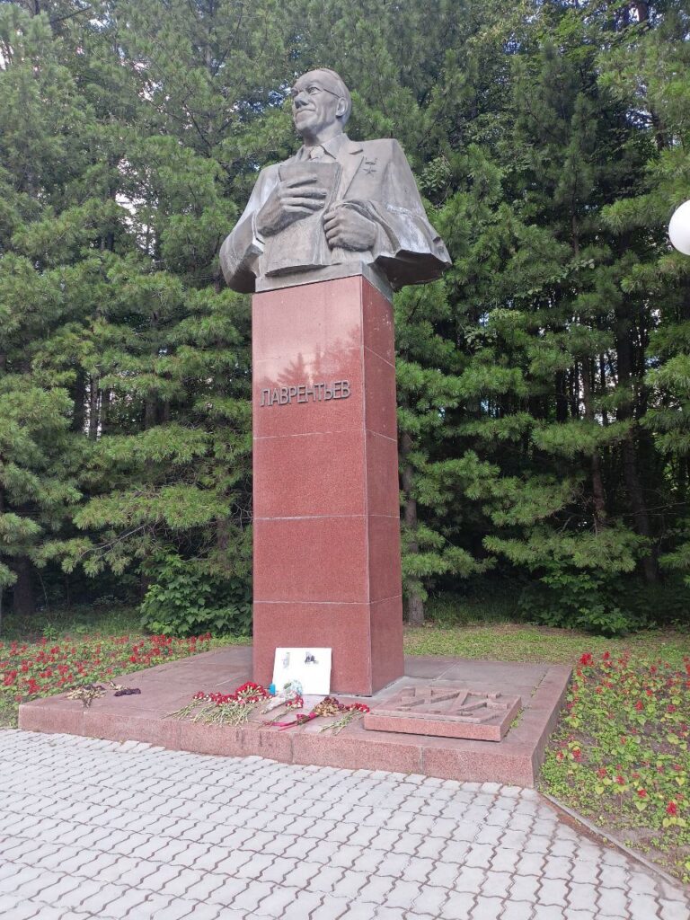 Ещё один похожий мемориал на следующий день появился у памятника академику Михаилу Лаврентьеву. Сюда полиция прибыла уже через полчаса.