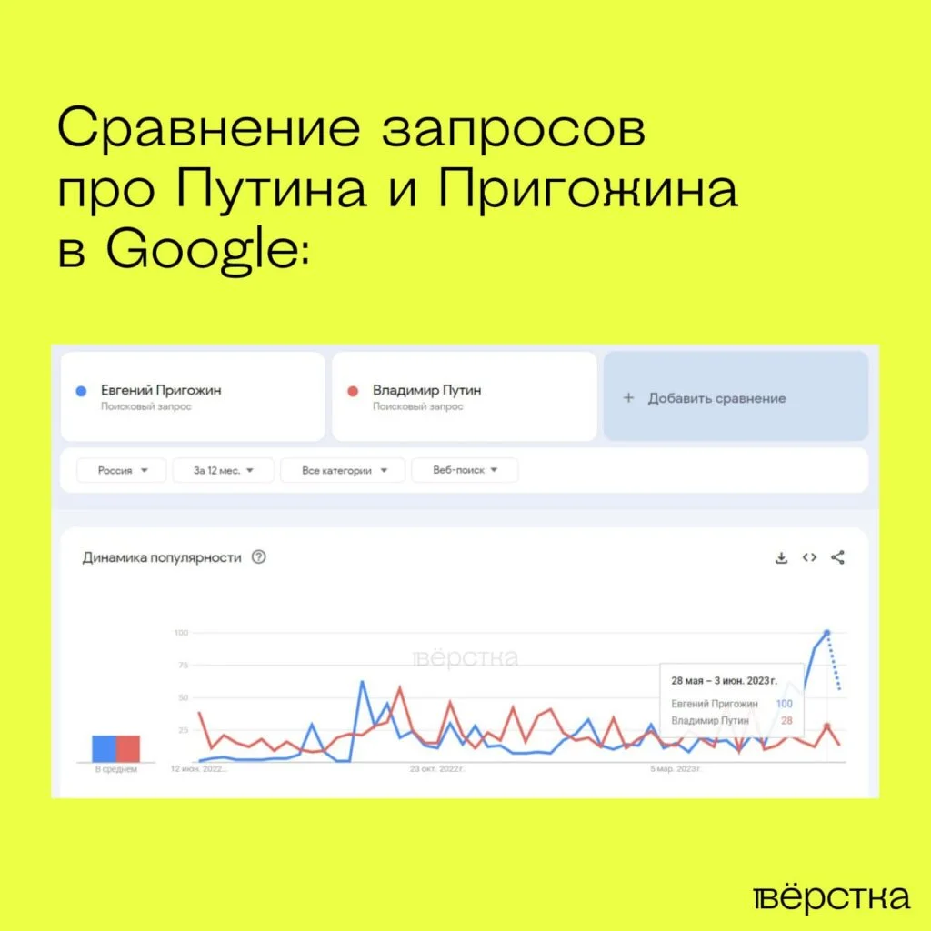 Согласно Google Trends, рост интереса к Пригожину начался в первых числах мая и достиг рекордных значений за всё время к концу месяца. Если с 28 мая по 3 июня динамика популярности владельца ЧВК была на уровне 100 баллов (наивысший показатель), то интерес к президенту в это же время был более чем в три раза ниже — он достигал лишь 28 баллов.