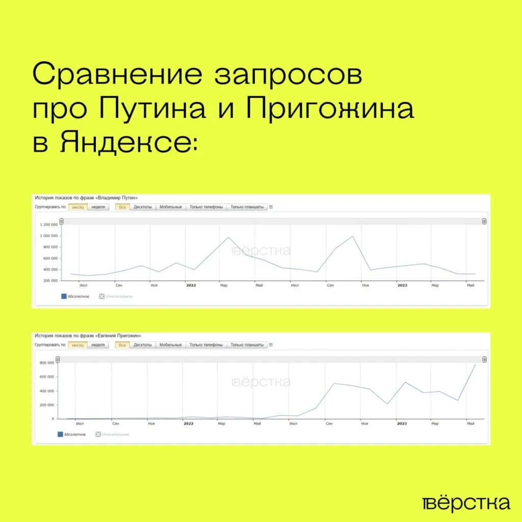 Тенденцию роста популярности Пригожина подтверждает и Yandex Wordstat. По данным сервиса, в мае через поисковик «Яндекса» информацию о «поваре Путина» запрашивали 744 тысячи раз (это также рекордные значения — предыдущий пик запросов о Пригожине пришелся на январь, тогда информацию о нём искали почти 498 тысяч раз). В то же время число показов по запросу «Владимир Путин» за май достигло лишь 305 тысяч — это в 2,4 раза меньше, чем у запроса «Евгений Пригожин».