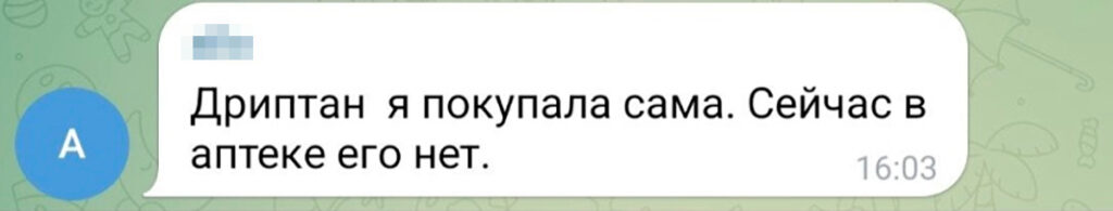 Но, связавшись с представителями фармацевтической компании Abbott, сотрудники фонда выяснили, что продажа «Дриптана» в России прекращена: «Это не логистика, не застрявшие машины на границе, это полное отсутствие препарата», — рассказывает Елена Морякина. При этом 14 марта 2022 года на сайте Abbott опубликовано официальное заявление, согласно которому компания останавливает «второстепенную деятельность» в России, включая инвестиции и рекламу, но не останавливает поставки жизненно важных лекарств.