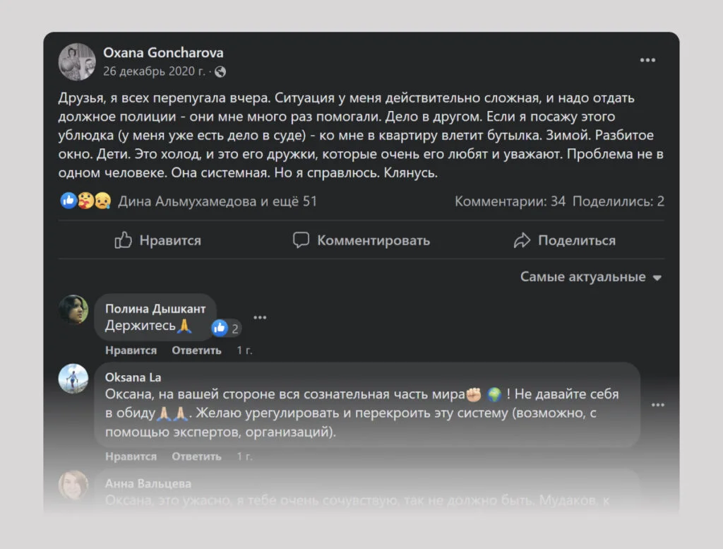«Я, видимо, была не одна, кто так сделал, — говорит Астахова. — Через несколько дней Оксана написала пост, что всё закончилось хорошо, потому что приехала полиция и он ушёл. Я ей написала в личку, и она мне рассказала, что он её избивает, обижает детей, и всё это длится многие годы».