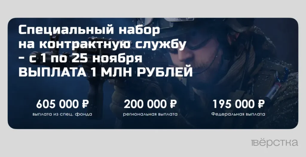 Выросла и единоразовая сумма, которую Правительство Московской области обещает добавить к федеральной выплате. На старте кампании в апрелеi контрактники получали 600 тысяч рублей, включая региональную надбавку в 405 тысяч. 3 ноября информация на сайте обновилась: разовая выплата выросла с 600 тысяч до 1 миллиона рублей. Уже 6 ноября была запущена первая рекламная кампания в «Яндексе» — вероятно, результаты набора контрактников к началу ноября не устраивали Правительство Московской области.