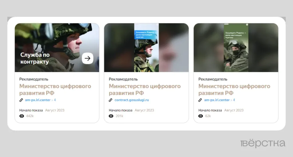 Минцифры совместно с другими органами власти только в рекламной сети «Яндекса» достигли более 200 миллионов показов баннеров с рекламой контрактной службы. «Вёрстка» нашла признаки размещения рекламы и в рекламной сети myTargeti, но не смогла оценить её объёмы.