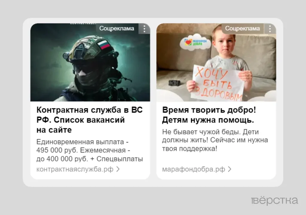 Скриншот рекламных баннеров военной службы в «Яндексе»