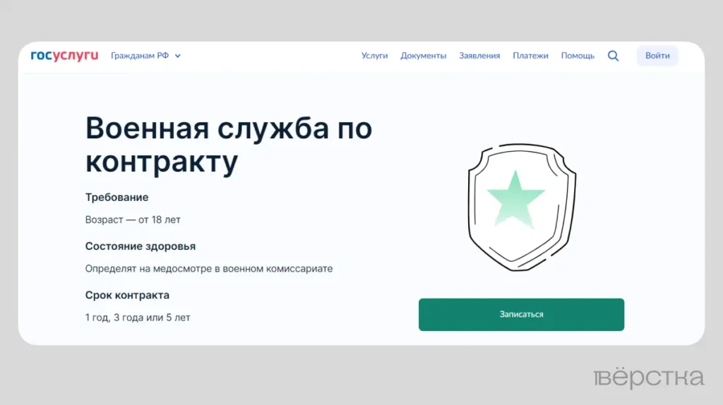 Скриншот рекламы военной службы с сайта Госуслуг