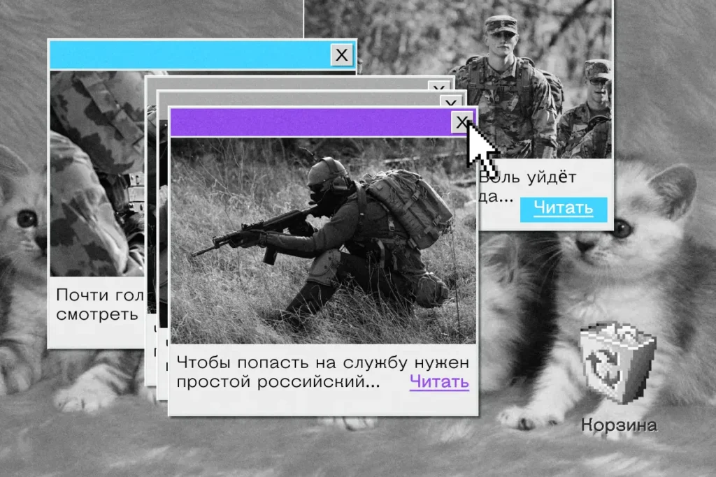 Каждое объявление, размещённое Минцифры, ведёт на один из двух сайтов: напрямую на Госуслуги или на поддомен ИРИi. Государственная услуга, продвижением которой занимается Минцифры, — это «Военная служба по контракту». Пользователям, которые кликнули на «социальную рекламу» от ведомства, на оформленной в стилистике Госуслуг странице предлагают подписать контракт с Минобороны.