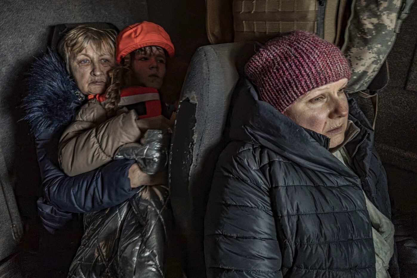 11-летняя Катя с бабушкой и мамой сидят в бронированном микроавтобусе во время эвакуации отрядом милиции «Белые ангелы» в Курахово, Донецкая область, Украина, 4 ноября 2024 года. Фото: ČTK / AP / Anton Shtuka/Profimedia.