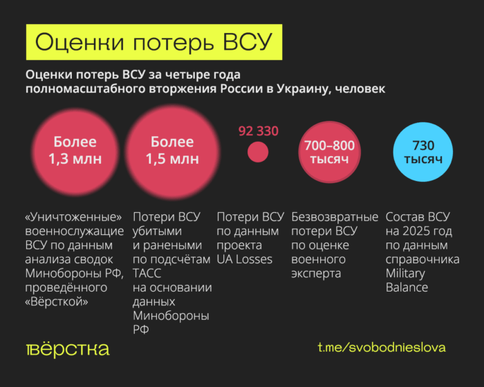 «Вёрстка» проанализировала сводки Министерства обороны за четыре года войны — самыми впечатляющими оказались данные о количестве потерь ВСУ. Так, за четыре года армия России «уничтожила» больше 1,3 млн человек. При этом, по данным справочника Military Balance, во всех вооружённых силах Украины на 2025 год было 730 тысяч военнослужащихi.