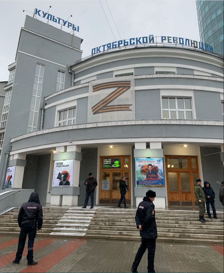 Утром 19 ноября в Новосибирске на улице плюсовая температура, в центре города, на площади Ленина, дежурят автомобили ДПС. На одноимённой улице из колонок театра кукол звучит песня Бременских музыкантов: «Нам дворцов заманчивые своды не заменят никогда свободы». ДК Октябрьской Революции находится в ста метрах, здание украшает огромный баннер в виде буквы Z.