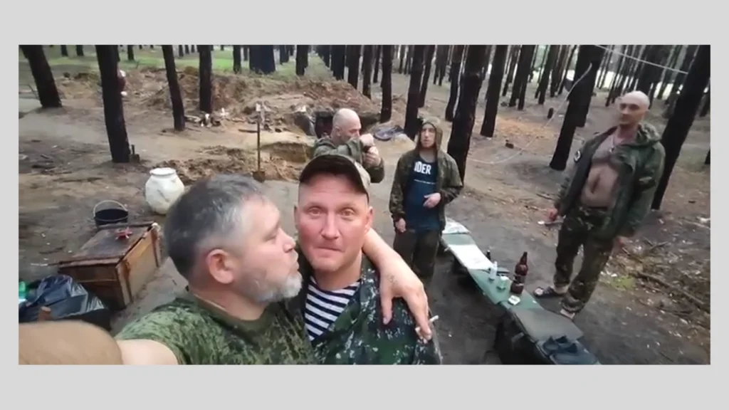 В кадре — лесополоса, блиндаж, двухлитровая бутылка с пивом на самодельной скамейке. Российские мобилизованные смеются и по очереди курят гашиш через жестяную банку.
