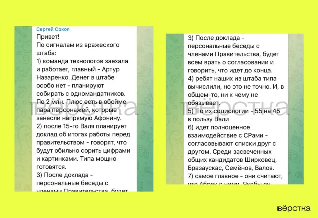 Единоросс рассказывает, что «Валя» — (Коновалов), «после 15-го планирует доклад об итогах работы перед правительством»: «будет обильно сорить цифрами и картинками. Типа мощно готовятся». А после доклада Коновалов якобы будет собеседовать членов правительства республики, «всем врать о согласовании» и «говорить что идёт до конца».