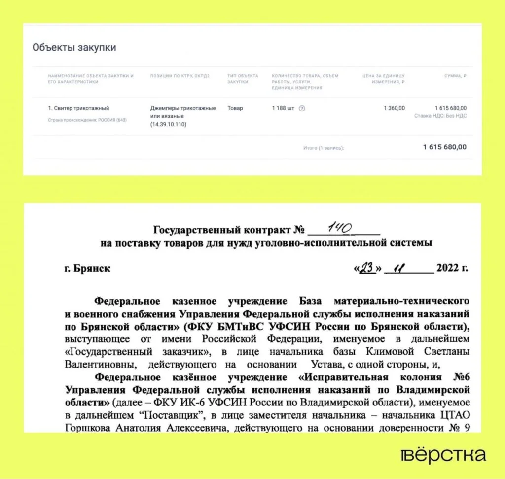 Также учреждение получило три тендера на пошив одежды — белья, маек и свитеров — и для заключённых. Общая сумма контрактов достигает почти 5 млн рублей. В рамках ещё одного контракта — от 28 ноября — колония Навального, помимо вышеупомянутых позиций, должна поставить ремни и полуботинки.