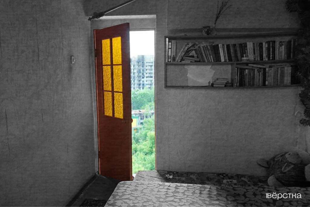 Когда я приходила во двор, часто видела на лавочке соседку, и она говорила: «У меня есть ключ от подъезда, давай я тебе открою». Заходишь в подъезд, стены облицованы плиткой лавандового цвета. Наш этаж — седьмой. Как попадаешь в квартиру, слева видишь коридор, а справа — комнату, где в разное время жили то я, то мама, то моя сестра. Чтобы попасть туда, нужно было пройти сквозь шторку из деревянных висюлек. В комнате — журнальный столик, диван и рабочий стол, за которым я делала уроки, когда ещё ходила в школу. Здесь я оставила часть своих вещей после переезда в Харьков. И когда уже мама поселилась в этой комнате, бабушка всё ругалась: «Сделайте что-то со своими вещами, уже некуда складывать».