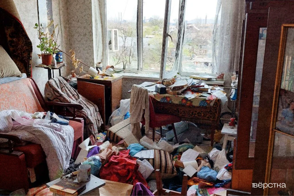 За стеной нашей квартиры образовалась пропасть вместо соседской трёшки — это обнаружила сестра, когда вернулась позже в дом за вещами. Все вещи были разбросаны. Бабушкин немецкий сундук украли мародёры вместе с другим ценным. Я просила забрать своё синее платье в белый горошек. Очень хотелось забрать фотографии, которые хранились за стеклом в бабушкином серванте, но сестра сказала, что растерялась: не понимала, за что браться, где искать вещи.