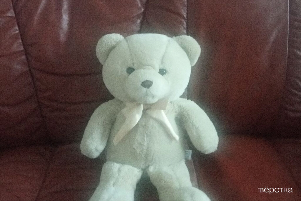Бывший муж забрал из квартиры белого медведя сына и передал нам. Медведь был грязным, чёрным, весь в саже. Мы его стирали-стирали — и он пожелтел. Так что теперь у моего сына жёлтый медведь, как когда-то был у меня.
