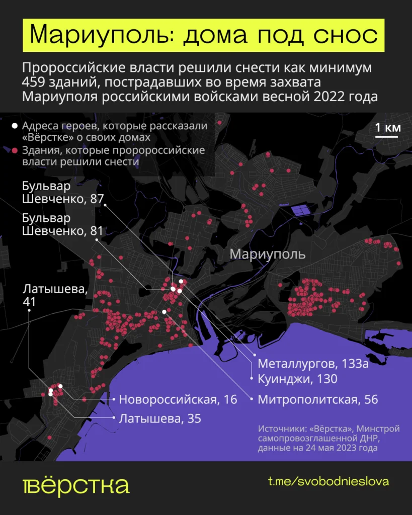 Новые власти Мариуполя гордятся темпами восстановления города. Во дворах, где ещё недавно жили десятки тысяч мариупольцев, сейчас пустыри — там закладывают фундаменты под новые ЖК. Пророссийские власти решили снести как минимум 459 зданий, пострадавших от бомбёжек и горевших весной 2022 года, — свежие распоряжения о сносе выходят каждый месяцi.