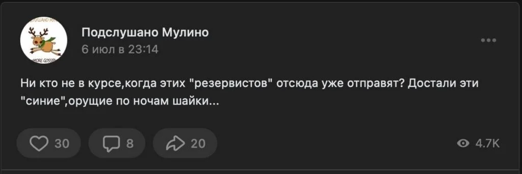 В августе в местных группах во «ВКонтакте» стали появляться жалобы на поведение военных, прибывших за последнее время. В нескольких постах жители Мулино требуют, чтобы добровольцы вернули им украденные сумки и документы. Одна из таких публикаций набрала 11 тысяч просмотров и сотни комментариев. В ней говорится: «Добровольцы! Верните рюкзак с паспортом, телефоном! Камеры зафиксировали вас».