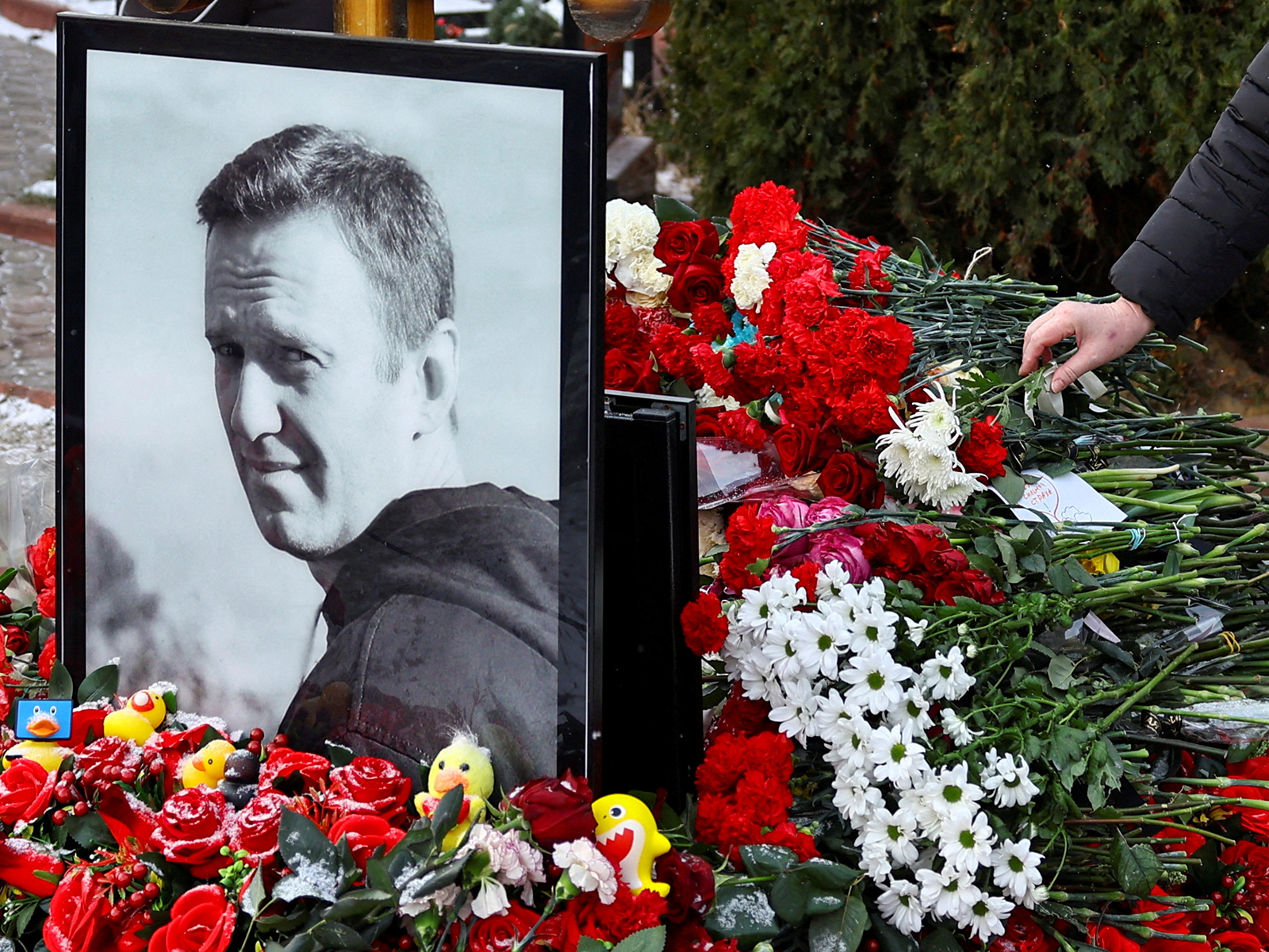 Фото: человек возлагает цветы на могилу Алексея Навального в годовщину его смерти на кладбище в Москве, 16 февраля 2025 года. REUTERS/Evgenia Novozhenina/File Photo
