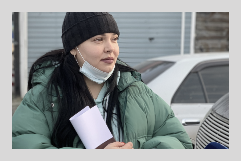 Перед тем, как группа зайдёт на территорию колонии, одна из самых активных родственниц — Наталья Джаниева — проводит короткий инструктаж для собравшихся. Женщины перешучиваются между собой о том, что их сбор могут принять за несанкционированный митинг.