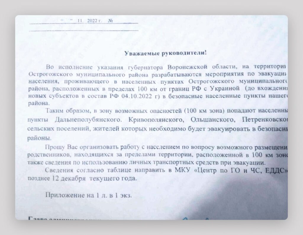 Власти Острогожского района Воронежской области готовят эвакуацию из 15 сёл и хуторов, расположенных «в пределах 100 км от границ РФ с Украиной (до вхождения новых субъектов в состав РФ 04.10.2022 г)», следует из письма районной администрации к «руководителям» (документ есть в распоряжении «Вёрстки»).