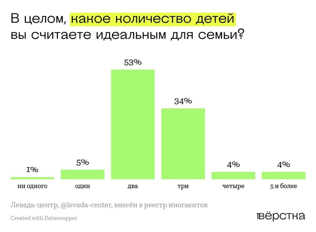 5% россиян считают, что в идеальной семье должен быть один ребенок, чуть более половины — двое детей, треть — трое, ещё 8% респондентов идеальной считают семью с четырьмя и более детьми. Отсутствие детей идеальным назвали 1% россиян.