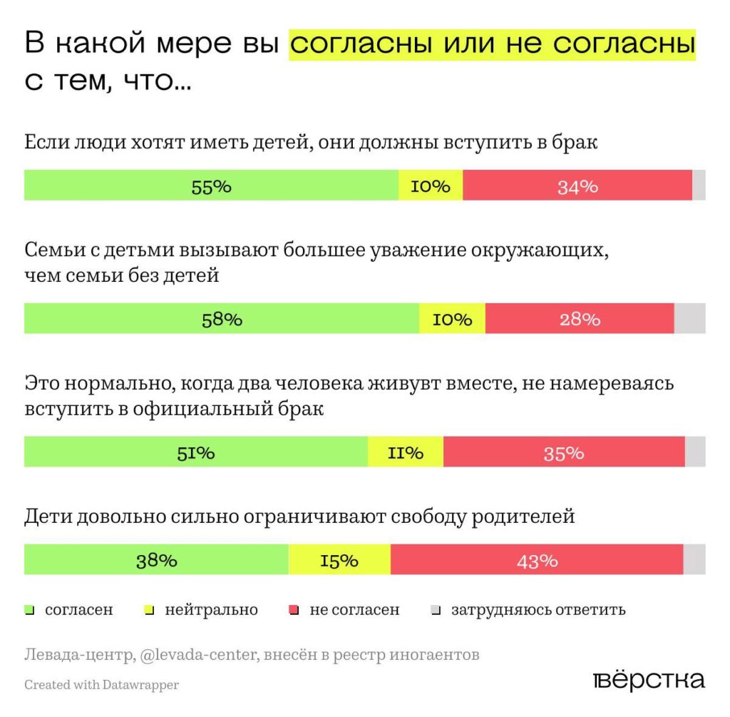 «Левада» утверждает, что россияне придерживаются скорее традиционных взглядов на семью, брак и гендерные роли. При этом в исследовании прослеживается поколенческий разрыв, связанный с размыванием поддержки социального института официального брака среди россиян 18–39 лет.
