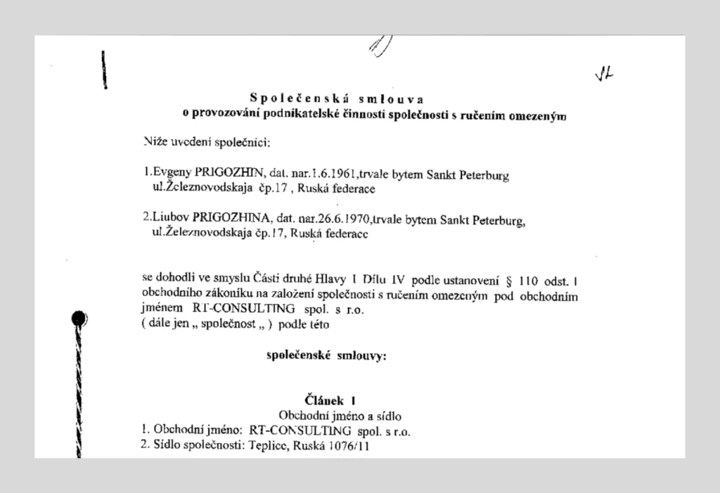 В октябре 1998 года в Чехии была зарегистрирована компания RT-Consulting, занимающаяся покупкой товаров для их последующей перепродажи. Её учредителями стали два человека — Евгений Пригожин и его жена Любовь, следует из документации юрлица. Там же было указано, что супружеская пара зарегистрирована в Чехии — в квартире на улице Ruska, находящейся в городе-курорте Теплице. Забегая вперёд, стоит сказать, что эта жилплощадь сегодня не принадлежит Пригожиным, архивных данных по ней найти не удалось.