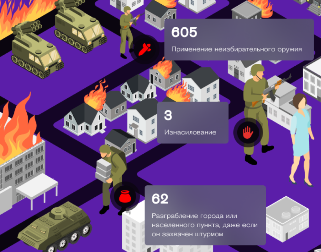Движение задокументировало 119 случаев уничтожения или присвоения чужого имущества в крупных размерах. О разграблении городов и населённых пунктов, включая те, что захватили штурмом, сообщалось 62 раза. О минировании населённых пунктов и объектов гражданской инфраструктуры — как минимум 80 раз. Об обстрелах незащищённых городов и деревень, где не было военных объектов, — как минимум 81 раз.