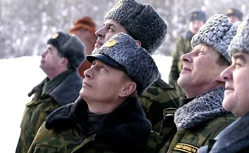 Однако постепенно и показной мачизм, и милитаризм в образе Путина стали проявляться все сильнее. Ближе к новым выборам 2004-го года президент стал чаще участвовать в военных учениях, мало того, он сменил роль стороннего наблюдателя и контролера на роль непосредственного участника. Во время испытаний ракеты «Молния‑М» Владимир Путин оделся в форму с эмблемой космических войск. Президент погрузился в море на атомной подводной лодке «Архангельск» и экипировался по этому случаю в морской бушлат. Таким образом Путин не только подчеркивал, что он Верховный Главнокомандующий армии, но и то, что он этой самой армии рядовой солдат, хотя в вооруженные силы СССР как срочник он не призывался. Позднее президент продолжит появляться в боевом антураже — то за штурвалом истребителя, то за прицелом снайперской винтовки.