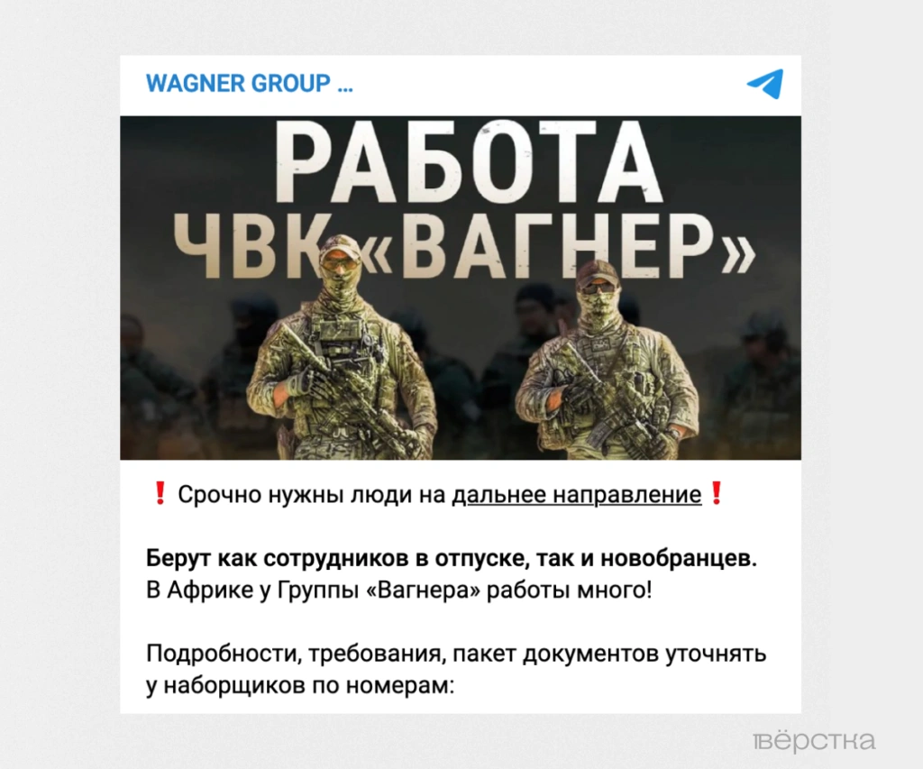 Последний набор в Африку стал самым массовым за всю публичную деятельность ЧВК «Вагнер» — его ведут сразу десять рекрутёров по десяти номерам. Ранее новобранцев набирали через один-два номер телефона, а единичные объявления об этом публиковали в профильных группах во «ВКонтакте». Теперь же за один только месяц в основном телеграм-аккаунте организации появилось более 18 постов. Кроме того, призывы присоединиться к группировке в личных аккаунтах публиковали и сами «сотрудники» ЧВК. (Напомним, ранее «Вёрстка» уже писала, что каждый третий «рекрутёр» «Вагнеров» имеет судимость).