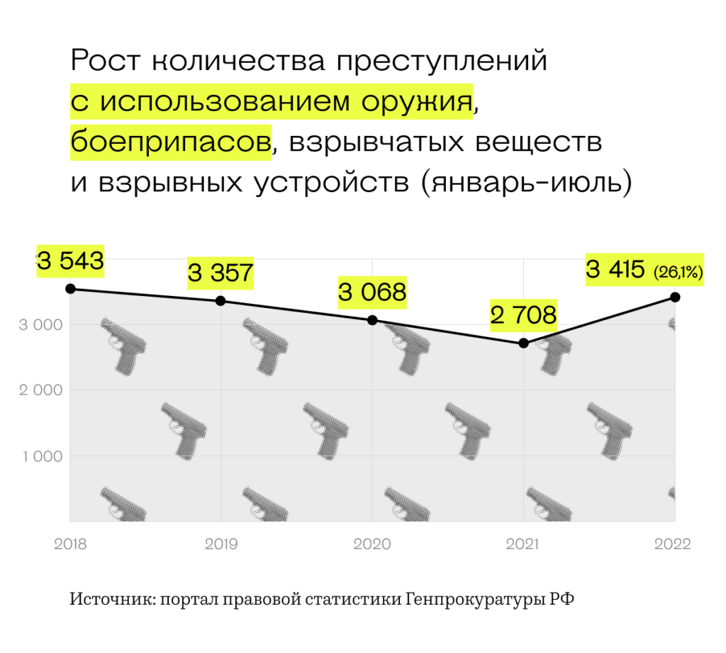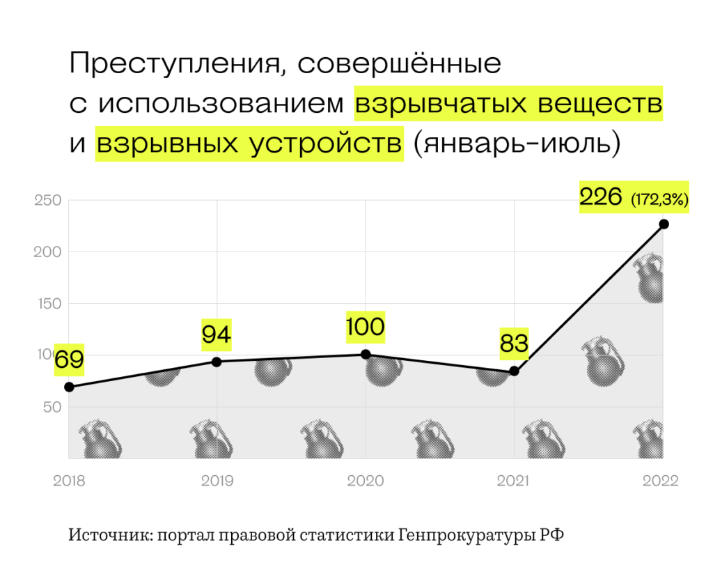 «Вёрстка» сравнила официальную статистику зарегистрированных преступлений за первые семь месяцев 2022 года (ее ведет Генпрокуратура) с показателями прошлых лет. Она показывает всплеск насилия и резкий рост преступлений с использованием взрывчатки и оружия.