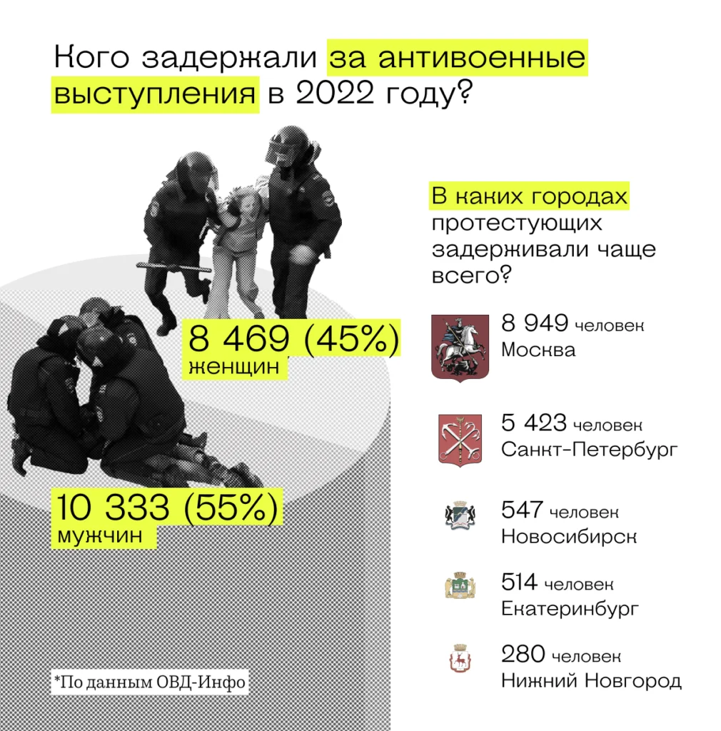 Цифры подтверждают активное сопротивление россиян: более 19 тысяч противников войны в 2022 году отправили в автозаки, более пяти тысяч — понесли административное наказание.