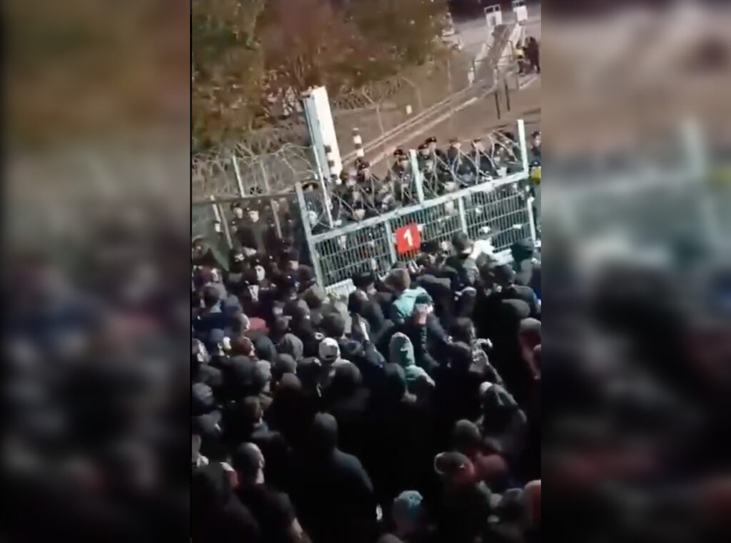 Толпа с криками «Мусора!» пытается прорваться к самолётам аэропорта Махачкалы «Уйташ» 29 октября 2023. Фото: скриншот из видео «Осторожно новости», t.me.