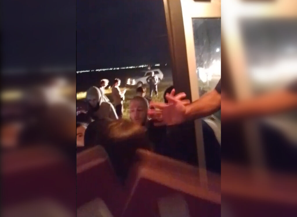 Толпа мужчин остановила автобус на федеральной трассе у Махачкалы, семьи с детьми показывают им российский паспорт, 29 октября 2023. Фото: скриншот из видео «Осторожно новости», t.me.