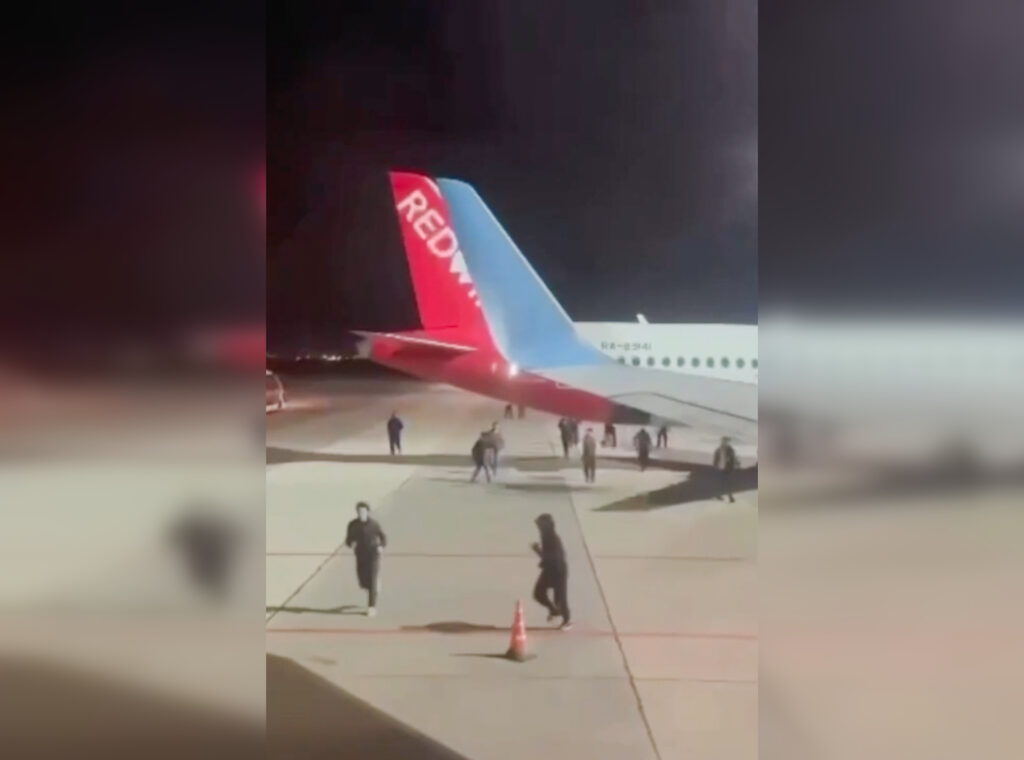 Пассажир изнутри самолёта снимает бегущую толпу в аэропорту Махачкалы «Уйташ» 29 октября 2023. Капитан самолёта призывает не открывать двери: «На улице разъярённая толпа. Вполне возможно мы тоже попадём под раздачу». Фото: скриншот из видео «Осторожно новости», t.me.