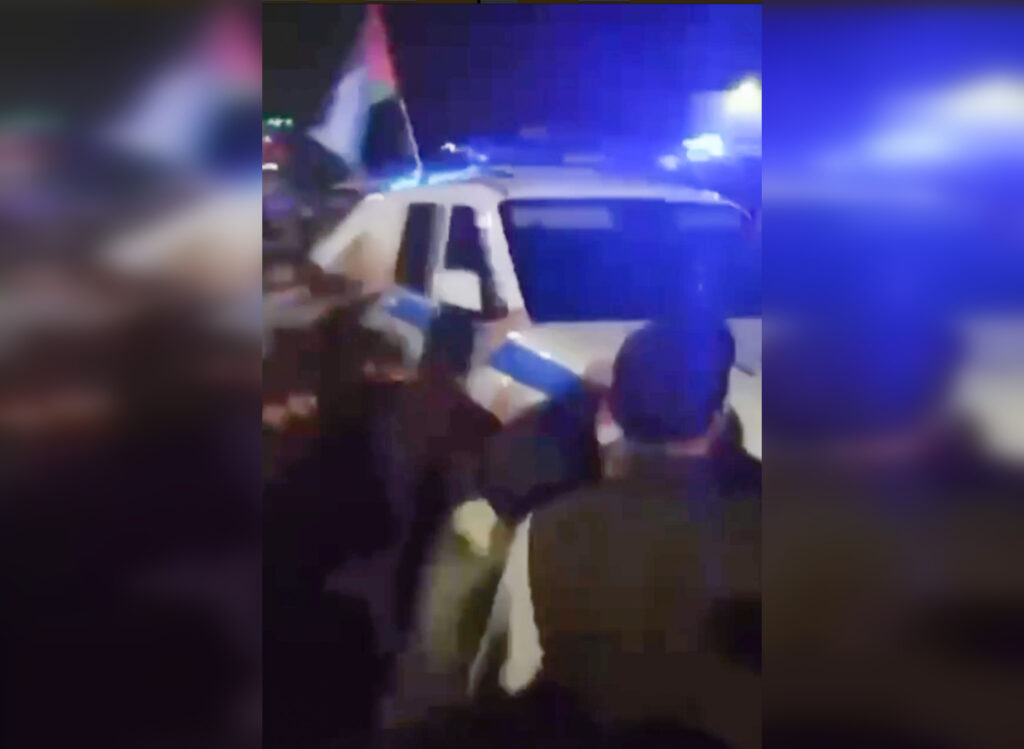 Толпа с флагами Палестины пытается перевернуть машину ППС в Махачкале 29 октября 2023. Фото: скриншот из видео «Осторожно новости», t. me.