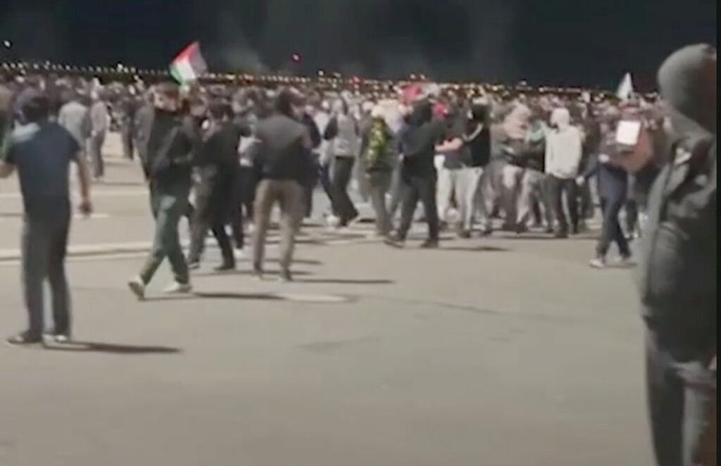 Толпа с флагами Палестины идёт по взлётно-посадочной полосе аэропорта Махачкалы «Уйташ» 29 октября 2023. Фото: скриншот из видео «Осторожно новости», t.me.